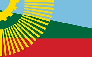 Un paño terciado en franjas desiguales en azul, verde y rojo con un cuarto de engranaje en el ángulo superior de la caña del que emergen diecinueve rayos trapezoidales.